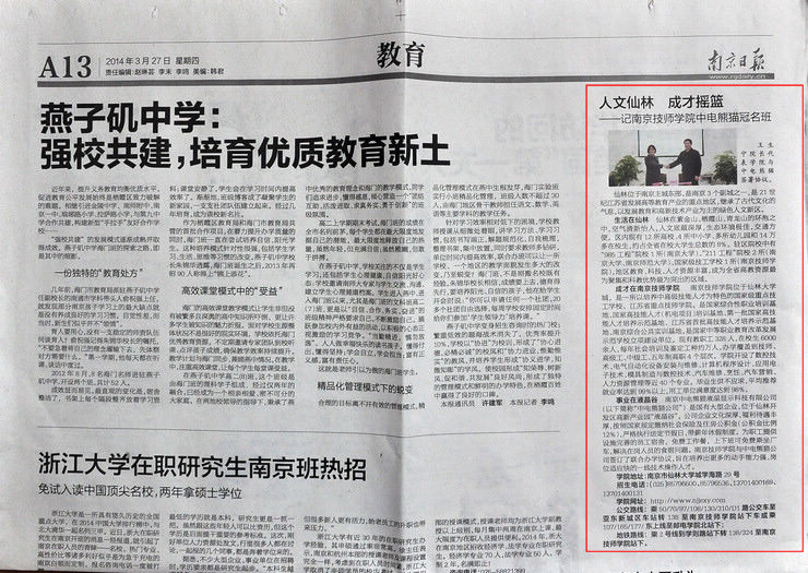 《南京日报》A13版—《人文仙林 成才摇篮—记南京技师学院中电熊猫冠名班》