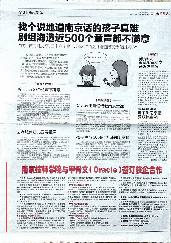 《南京晨报》A10版—南京技师学院与甲骨文(Oracle)签订校企合作