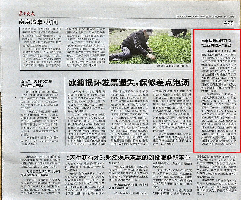《扬子晚报》A28—南京技师学院开设“工业机器人”专业