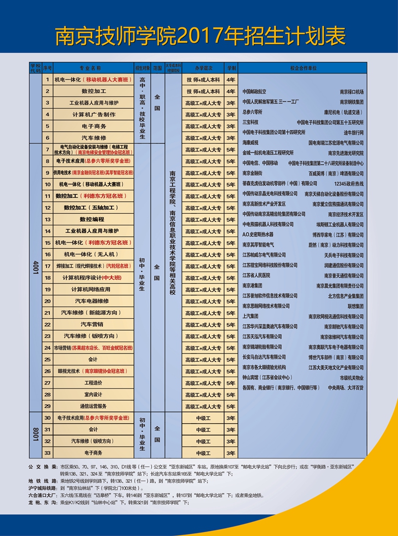 地铁线路:乘地铁2号线到学则路下,转138、321(任一)路,到“南京技师学院”站下;