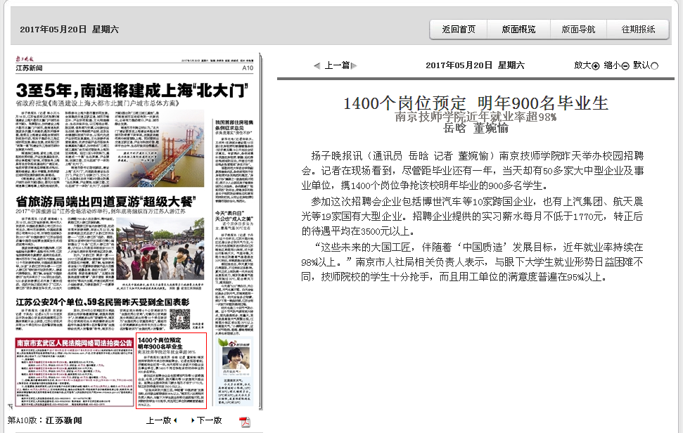 《扬子晚报》A10—1400个岗位预定 明年900名毕业生