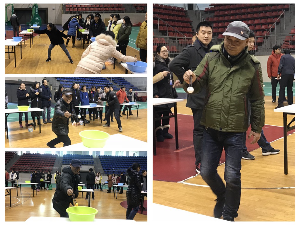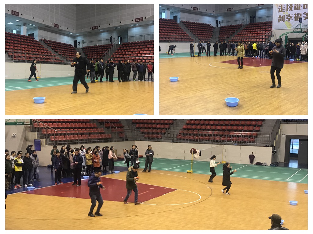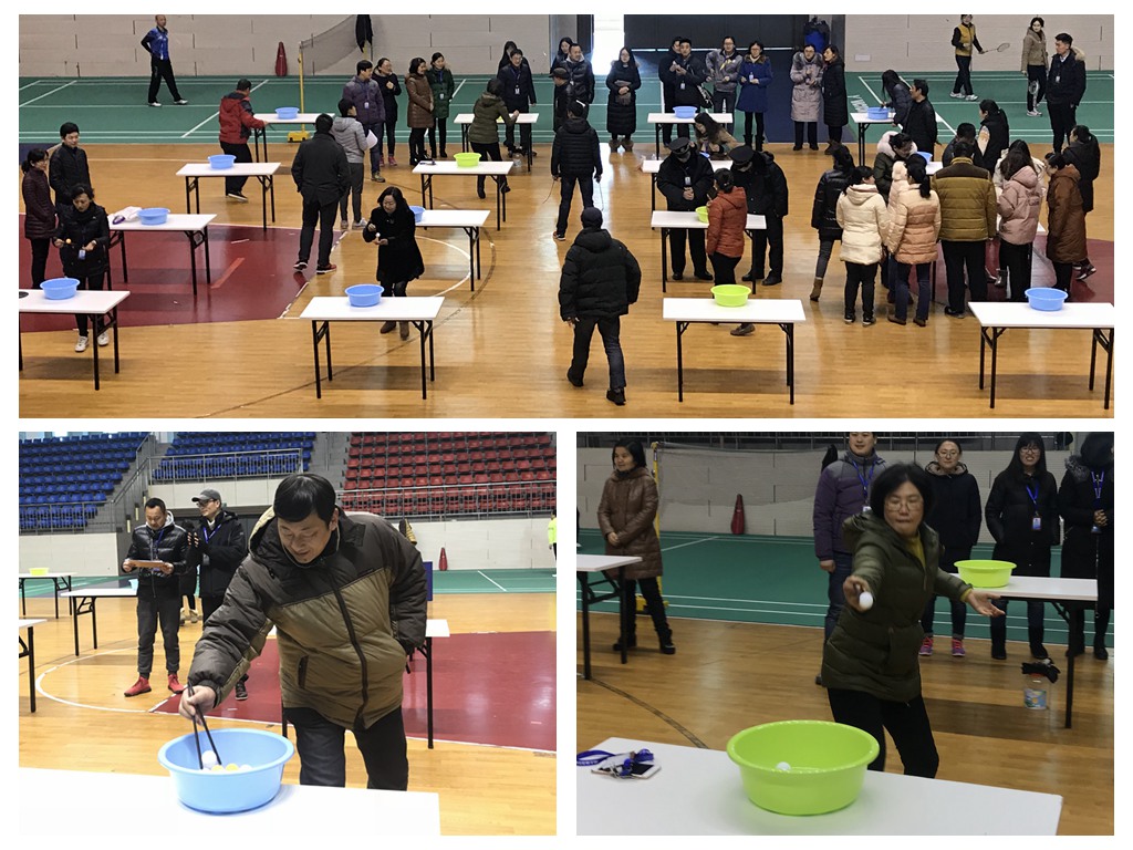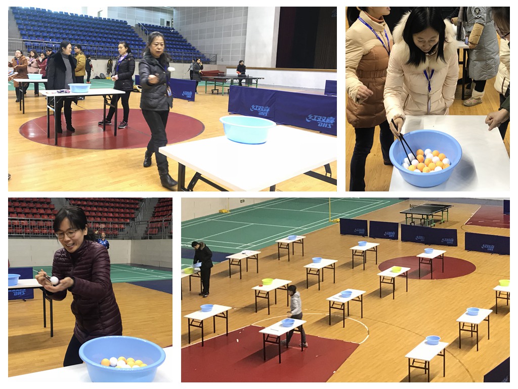 天气虽冷,但教工的心是火热的,教职工乒乓球趣味比赛项目托球跑、夹球跑正在室内体育馆激烈的比拼着......正所谓:甩掉薄棉袄,夹球托球用力跑,兴奋又紧张,争分且夺秒。裁判执法严,队员表现好,激烈而有序,忙碌不乱套。加油声音大,掌声响云霄,身上暖融融,心中乐陶陶。团队意识强,众人兴致高,努力创佳绩,欢笑满场飘。