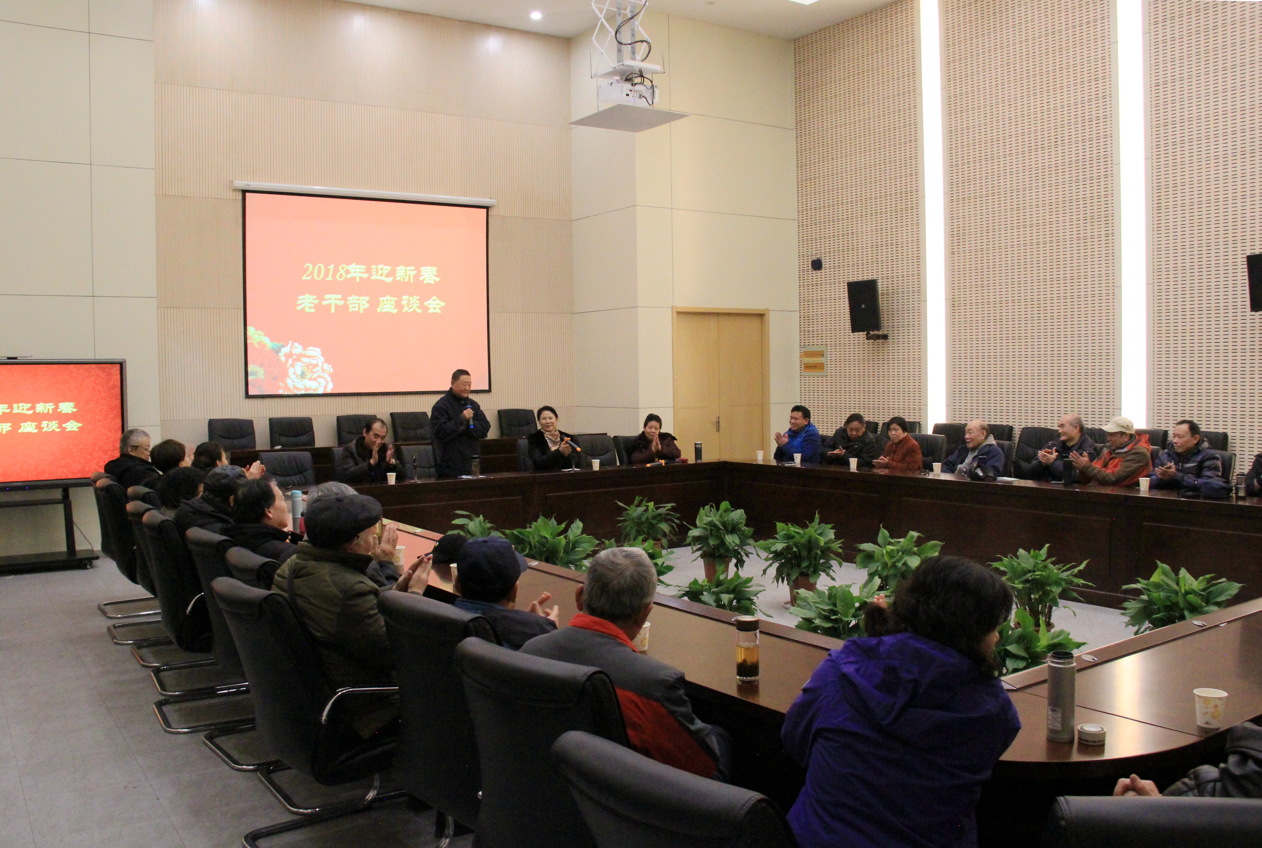 2018年1月15日,学院实验楼一楼会议室喜庆洋溢、欢声笑语,这里正在举办迎新春老干部座谈会,40余位退休教师参加了座谈。学院党委书记、院工会主席张金梅及院长侯放出席会议,向老教师们致以了节日的祝贺和亲切的问候。