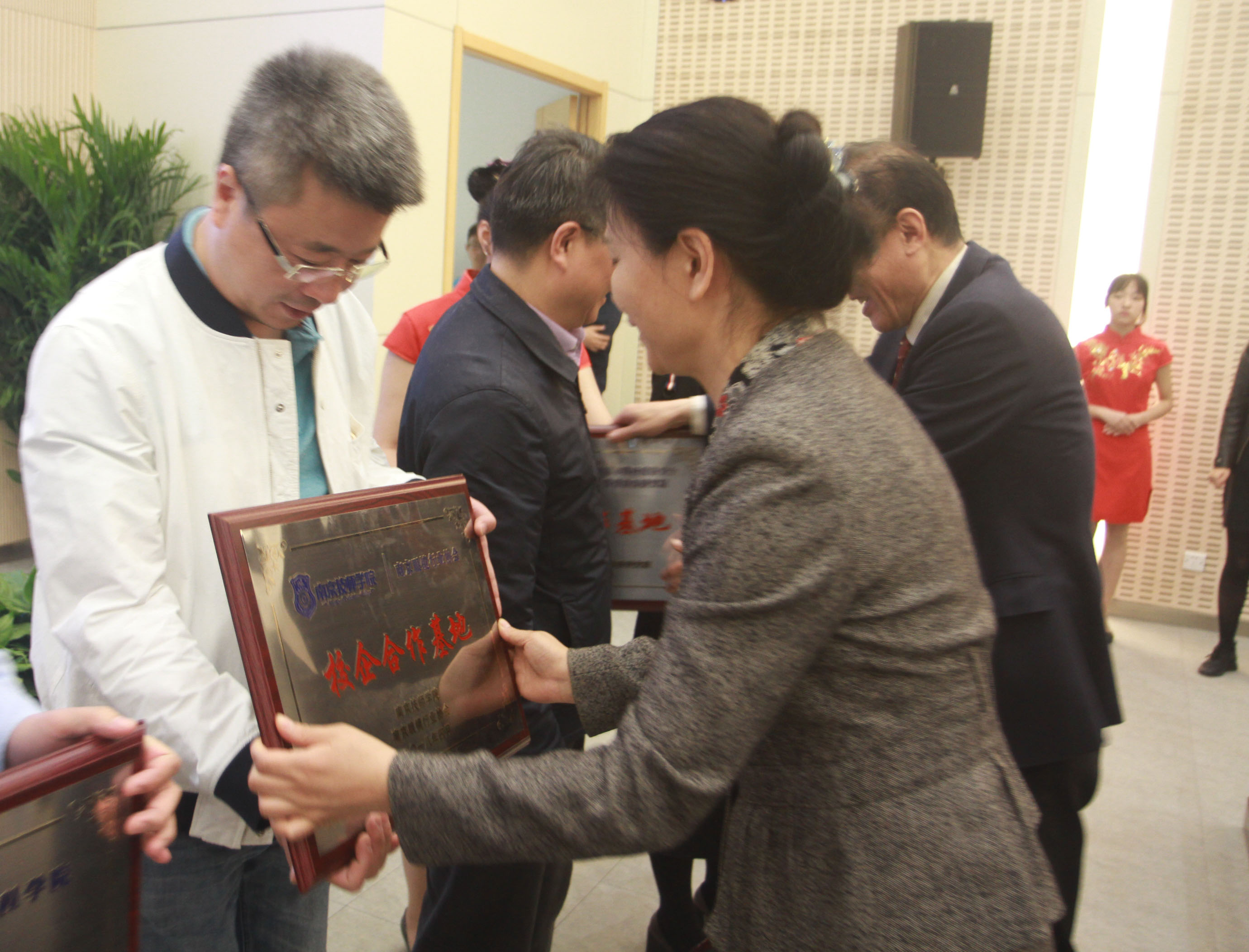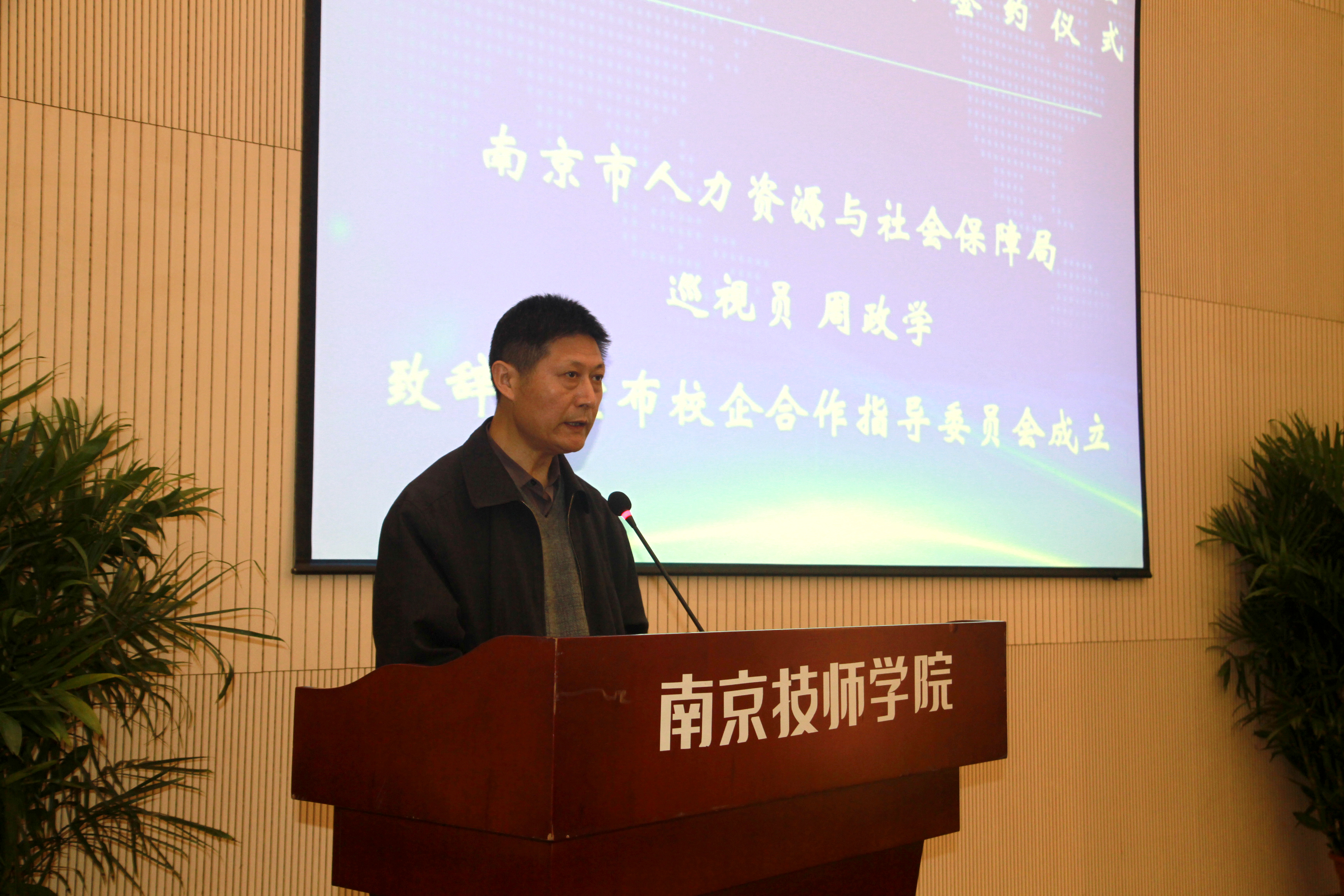 仪式上,市人社局巡视员周政学致辞并宣布首届校企合作指导委员会正式成立。致辞中,他强调校企合作要充分发挥政府“稳定器”作用,充分发挥企业“动力器”作用,充分把握技能人才培养“方向盘”。南京技师学院院长侯放代表学院致辞,介绍我院基本情况与三年发展规划,并与院书记张金梅一起为14家校企合作指导委员会委员单位授予了“南京技师学院校企合作基地”铜牌,与18家新合作企业签订了校企合作协议书。