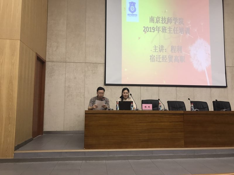2019年5月17日,南京技师学院举行全体班主任培训会议。培训邀请了宿迁经贸高等职业技术学校的程利老师主讲。程利老师是学工主任,高校副教授, 获得过宿迁市“先进工作者”等荣誉称号,获得了江苏省职业教育“示范课”一等奖两次,江苏省“信息化大赛”一等奖两次,全国信息化大赛荣获一等奖第一名。在去年的第三届全国中等职业技术学校班主任基本功大赛中,荣获综合一等奖和两个单项‘十佳’奖。