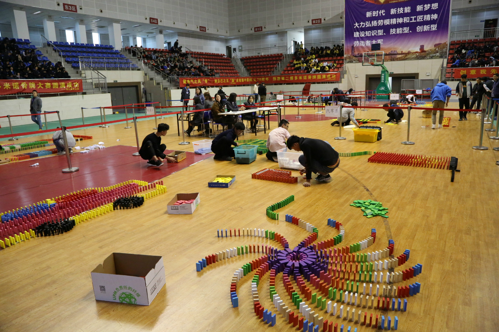 赛场上,各系学生沉着冷静、有条不紊地快速拼接着各种图案,抒发对祖国的深情厚谊。综合场内外裁判评分,汽车技术系和现代服务系分别获得第一、二名。其中,汽车技术系以《我与祖国同行》为主题,运用3200多块骨牌,相继拼接出56个民族56朵花,金字塔结构的“三座大山”等图样,寓意着在中国共产党的领导下,勤劳智慧的中国人民克服千难万险,过上了幸福的生活。推倒时采用螺旋式,一次性成功,赢得场内阵阵欢呼。服务系以《我和我的祖国》为主题,运用2600多片骨牌、8种颜色组成漫漫长路、天安门、“祖国生日快乐”等图样,象征着中华儿女走遍祖国的大好河山,向中华人民共和国成立70周年献上最真诚的祝愿。