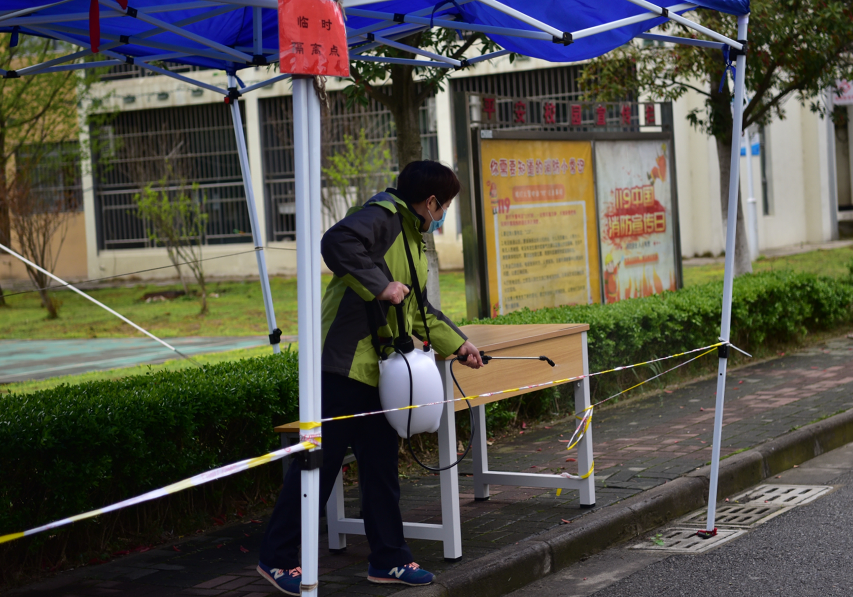 约20名学生在教室全程佩戴口罩上课,单人单座并与其他同学保持一定距离,课前、课间、午休时间开窗通风,放学后对教室地面和课桌椅进行杀毒。