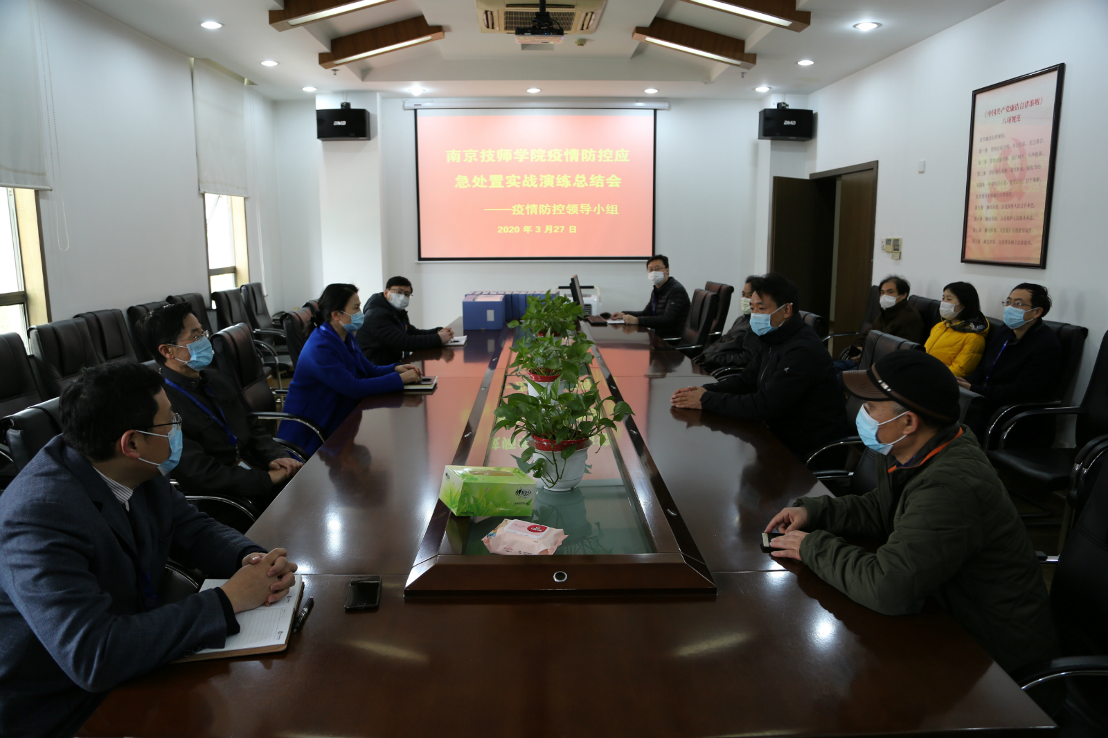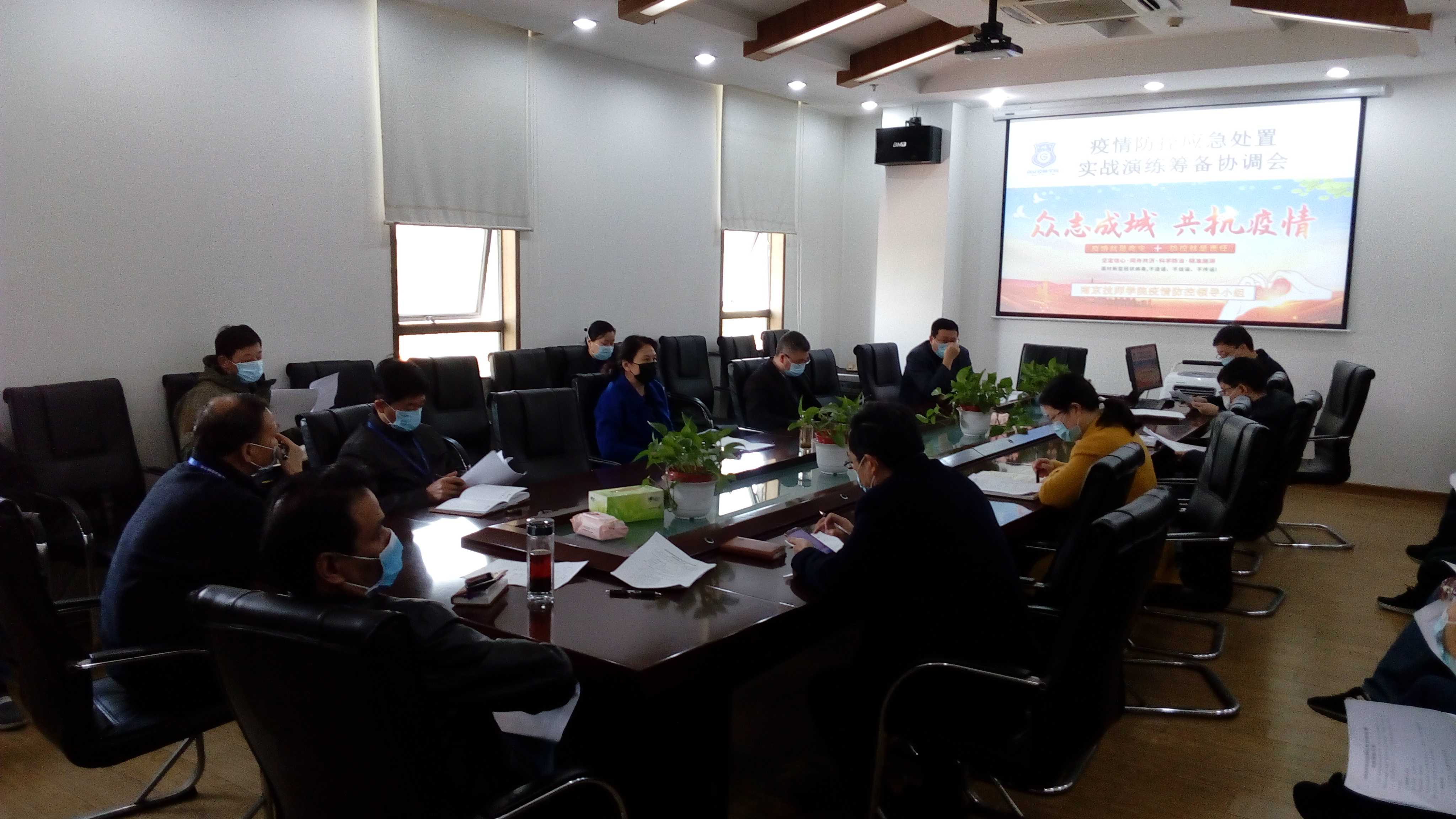 3月24日上午,学院召开实战演练筹备协调会,疫情防控领导小组成员集中讨论、筹备协调,完善演练脚本,细化演练责任,补全演练漏洞。