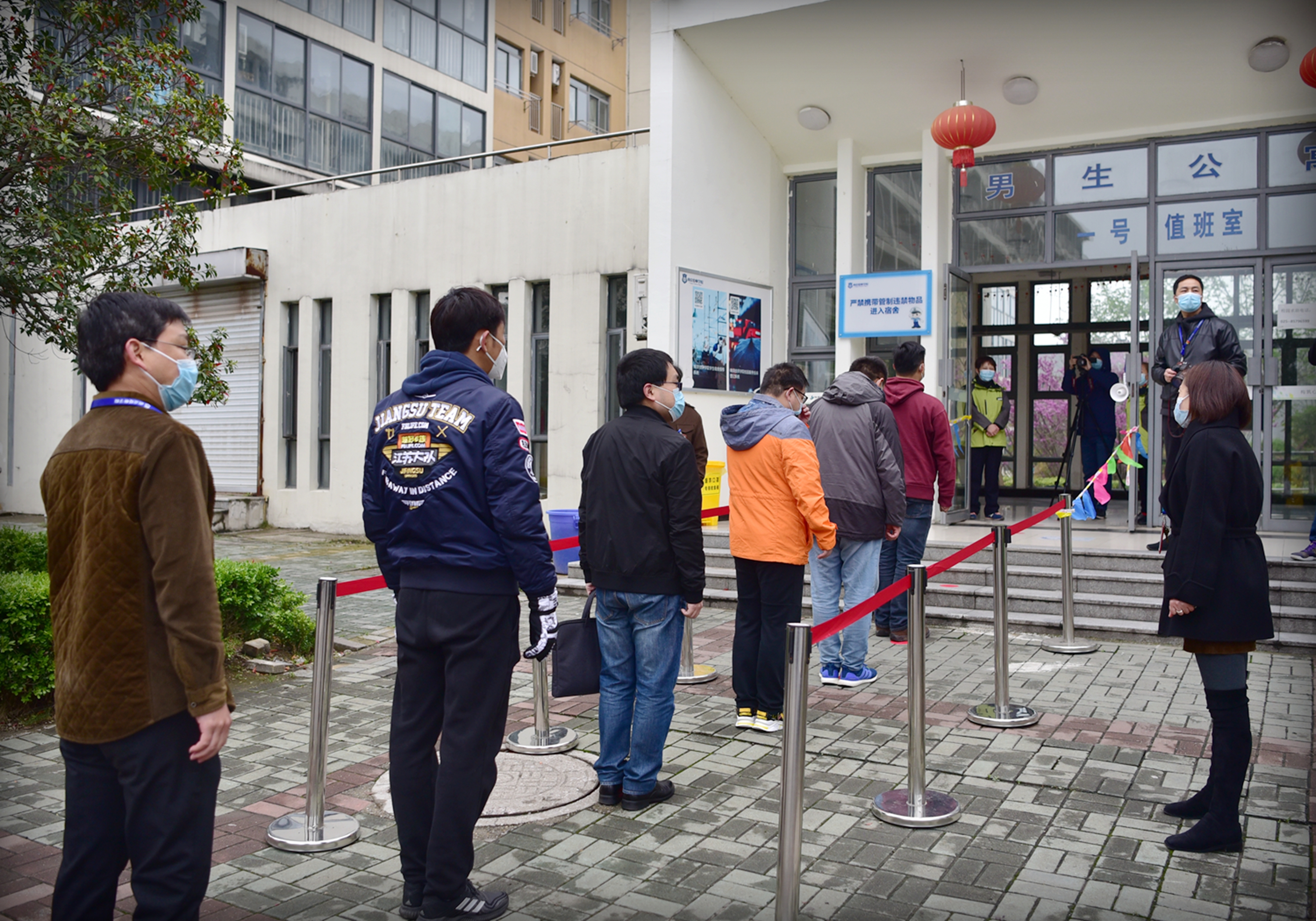 中午,住校生约20人保持1米以上的间距,按要求从管控通道按顺序进入宿舍。
