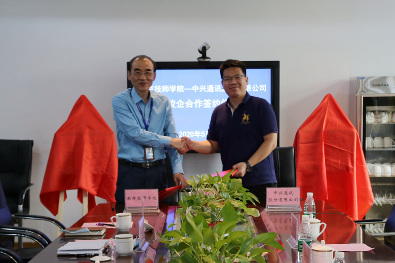 2020年5月22日下午,学院与中兴通讯股份有限公司校企合作签约仪式隆重举行。中兴通讯全国人力资源总监张德志、全国人力资源经理屈龙涛、高惠平,学院院长侯放、副院长王杭贵等领导以及双方有关人员参加了签约仪式。