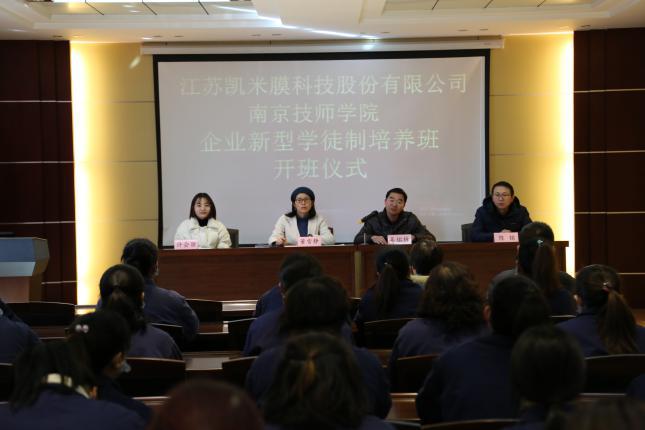 2021年1月12日下午,江苏凯米膜有限公司携手南京技师学院举办了企业新型学徒制培训开班典礼。江苏凯米膜有限公司人力资源部总监董雪静、人力资源部经理许会丽,南京技师学院电气工程系主任吴佑林、招生就业处陈铭副主任以及相关专业教师、全体培训学员参加了典礼。