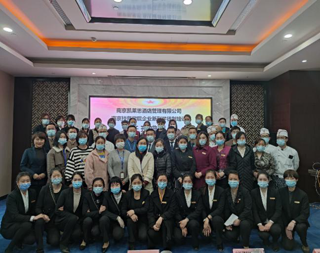 2021年1月21日下午,南京技师学院与南京凯莱思酒店管理有限公司(以下简称金陵新城饭店)举办了企业新型学徒制培训开班典礼。金陵新城饭店蒋茂飞总经理、杨萍、王玉范、袁万国等相关部门领导,南京技师学院现代服务系武剑刚主任、招生就业处郑燕副主任、现代服务系胡珍霞副主任、董昱麟、夏倩、张先梅、魏红、路钰老师及全体培训学员参加了本次开班仪式。