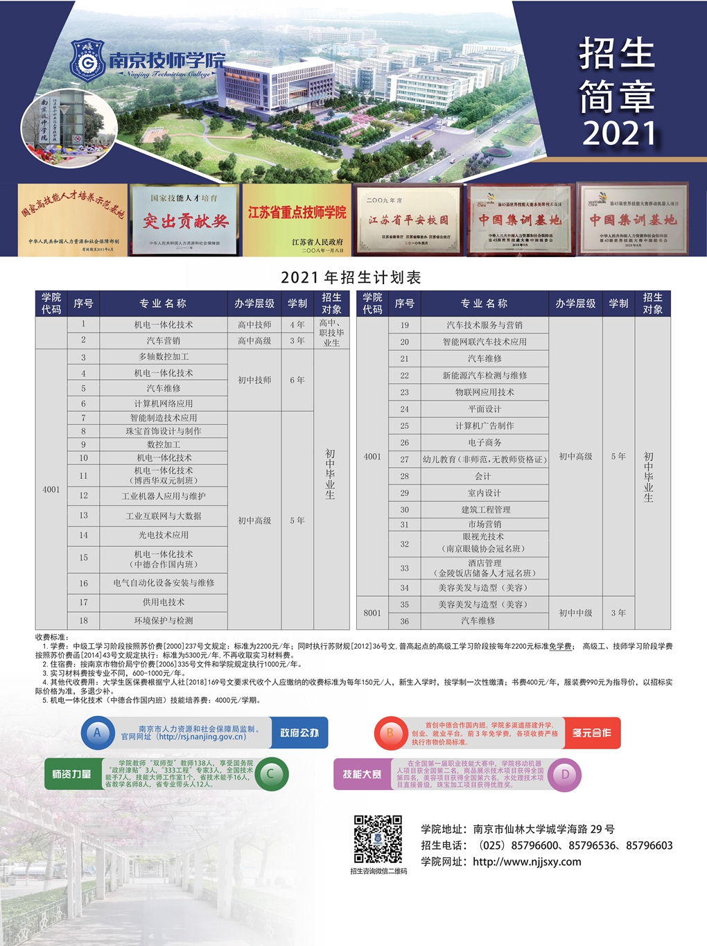 2021年南京技师学院招生计划表