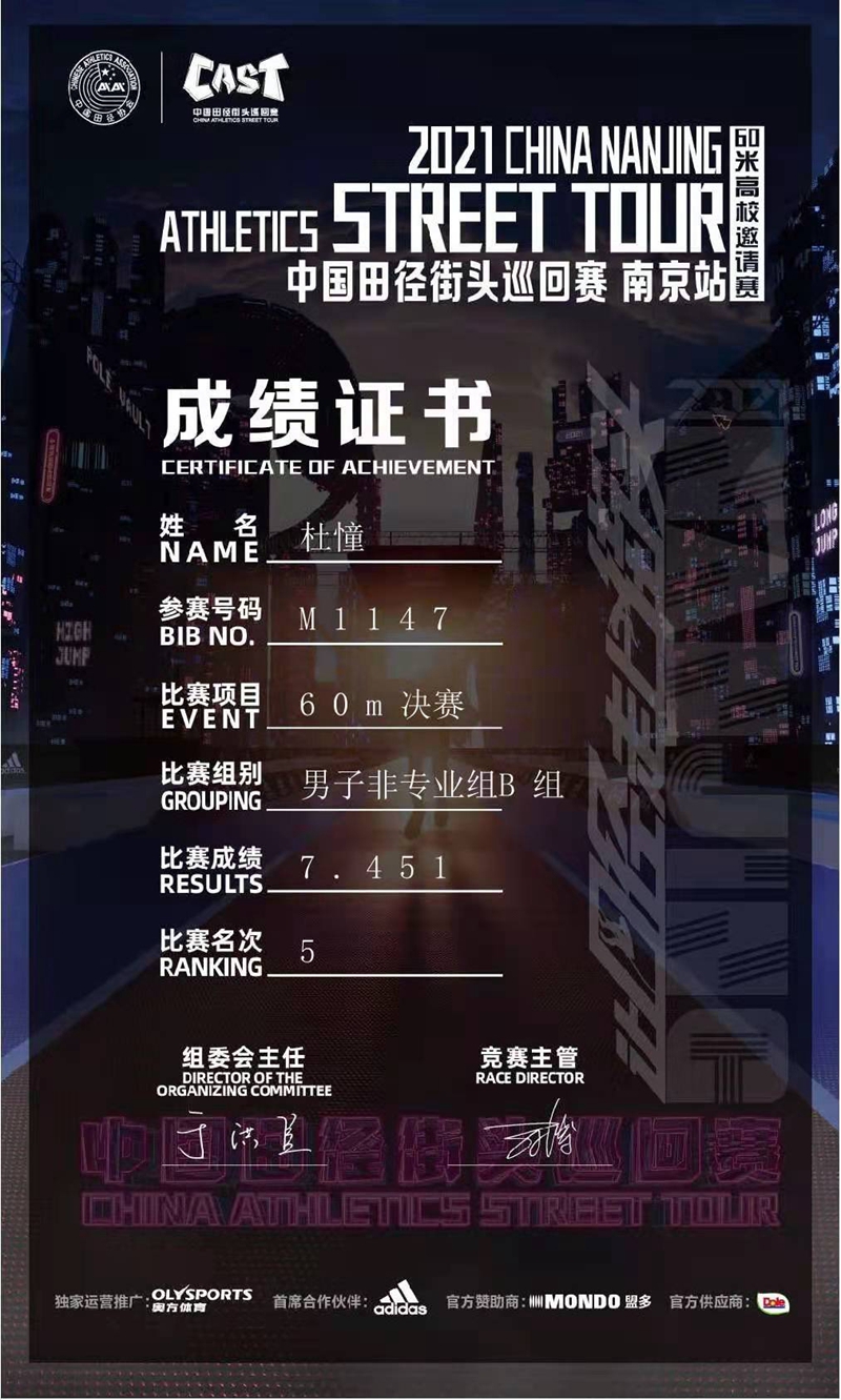 5月15日,2021年中国田径街头巡回赛南京站60米高校邀请赛举行,本项比赛邀请到栖霞区仙林12所高校,共有百余名大学生根据竞赛要求组成专业组与非专业组。我院运动小将杜憧不畏强手,敢打敢拼,获得B组决赛第五的好成绩,展现了我院学生积极向上的体育精神,良好的竞技风貌也给主办单位和观众留下了深刻印象。