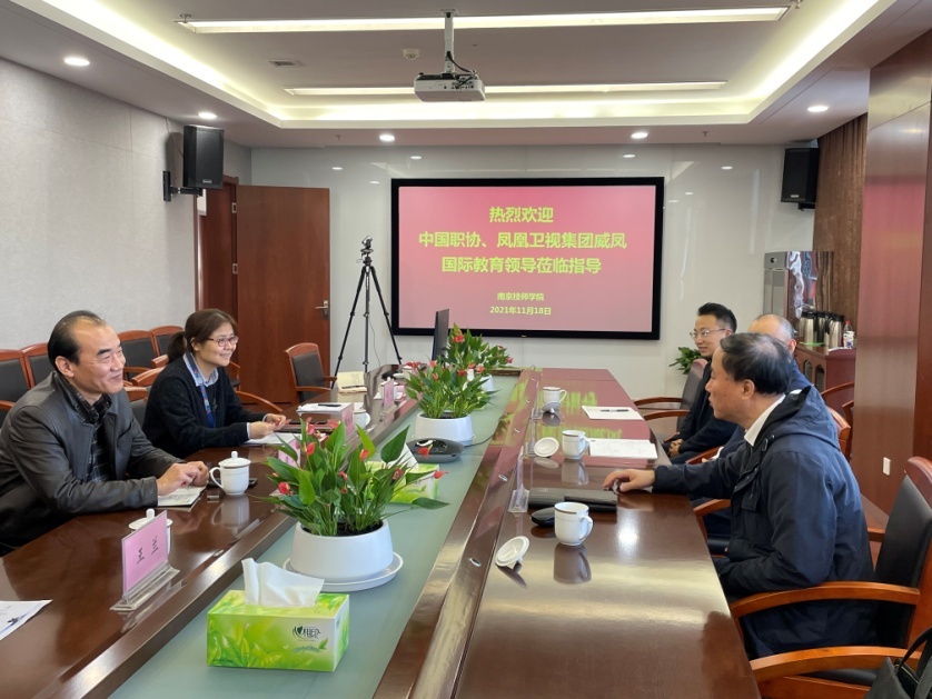 2021年11月18日中国职工教育和职业培训协会培训项目负责人王社宁、凤凰卫视集团威凤国际教育副总经理冯波、江苏区域经理贾志建莅临我院,开展关于《技工教育数字化改革创新专项课题》的调研,我院院长侯放、教务处主任鲍咏梅、副主任王兰、智能制造系主任刘立及相关专业教师参与了调研座谈会。