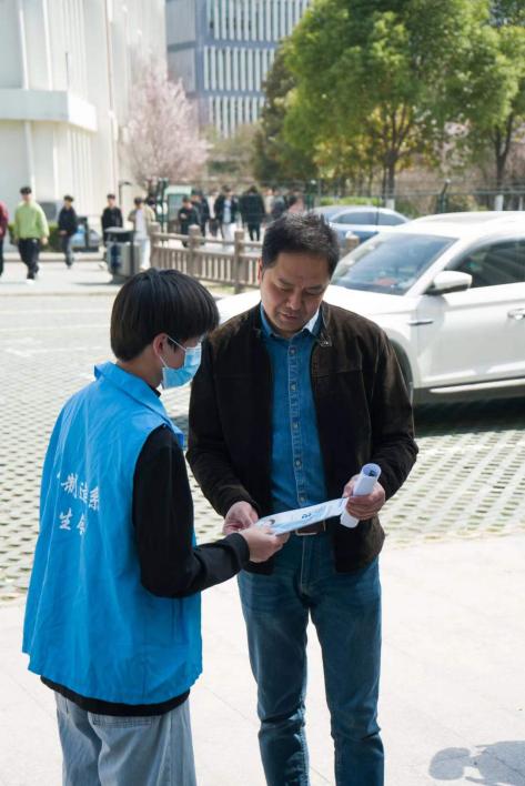 活动期间,智能制造系主任刘立、林润海等老师,与志愿者们分批在一食堂门口进行防疫宣传,并为过往的老师、同学免费发放爱心口罩。