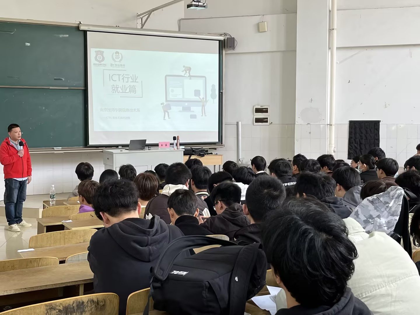 又即将迎来一个毕业季,为推进我校毕业生就业工作,针对毕业生热情度高但阅历尚浅、思维活跃但经验不足、求职心切但相关法规了解不详等特点,南京技师学院信息技术系为2019级学生开展实习工作指导会、树立正确的择业观和就业观。按照学院实习工作部署,信息技术系于2023年4月7日下午在J3大阶梯教室举办了就业指导专题讲座,南京牧信科技有限公司王乐应邀到校担任主讲,100余名师生代表到场聆听。