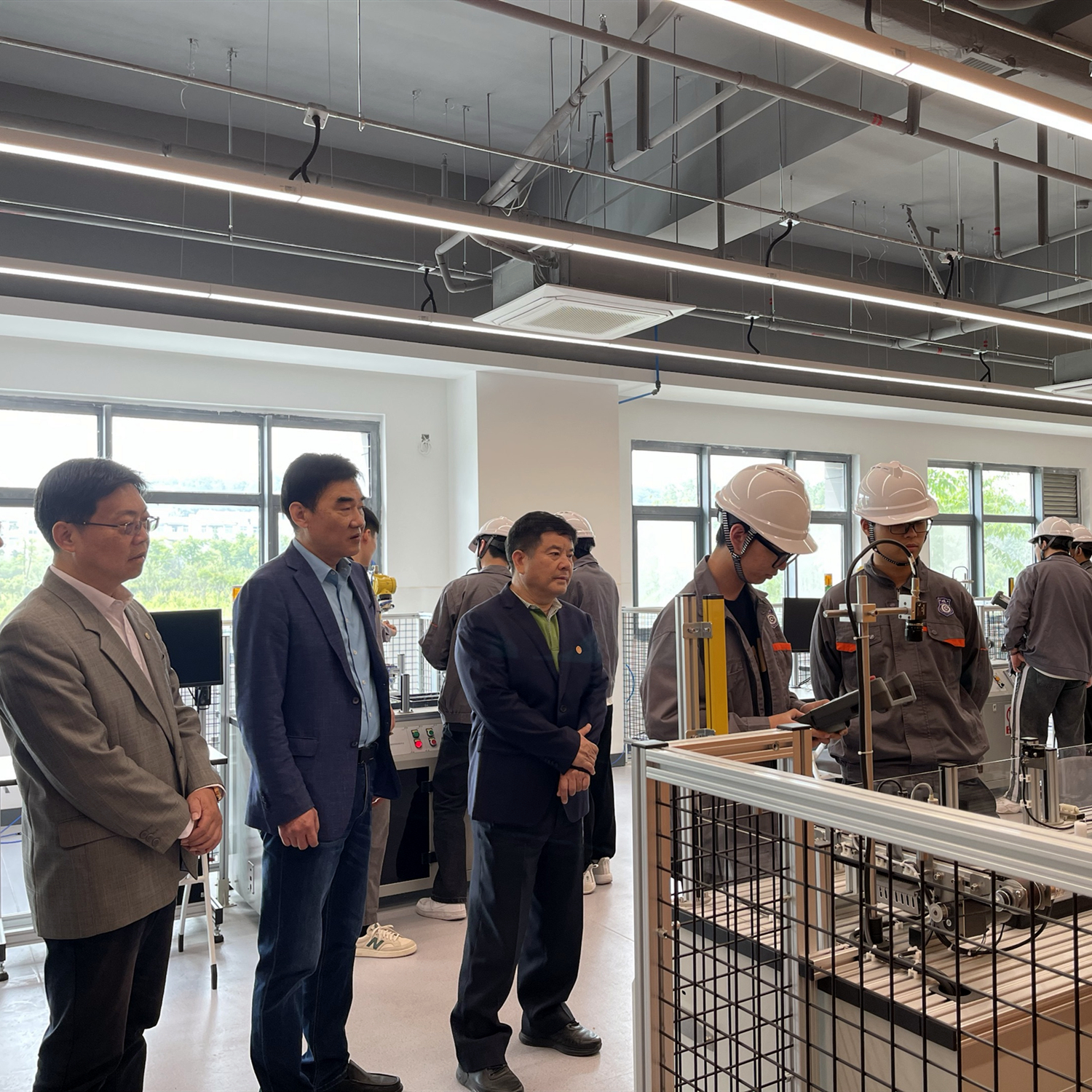 座谈会前,考察组成员先后参观了新能汽车、水处理、移动机器人等实训基地和智能制造生产线等,在调研考察的过程中,考察的一行成员对学院的实训项目进行了客观、深入、全面的了解。特别是对污水处理项目表示了高度肯定,智能制造生产线实训基地也赢得了考察队伍的一致好评。
