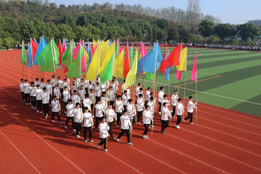 国旗队、校旗队、鲜花队、彩旗队组成的四个方队以及各系学生代表组成的方阵昂首挺胸,以整齐的步伐、响亮的口号、昂扬的斗志依次入场。