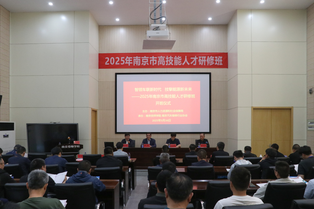 为加快高技能人才培养,提升南京市高技能人才队伍建设水平,由南京市人力资源和社会保障局主办、南京技师学院承办的新能源汽车智能网联技术应用高技能人才研修班(简称“高研班”)于2025年5月16日上午在南京技师学院信息楼隆重开班,83名学员共同开启了本次研修之旅。开班仪式由南京技师学院副院长赵杰主持,市人社局职建处处长朱清怡、市汽车维修行业协会常务副会长彭鲁洲、院党委副书记、院长侯放出席仪式并致辞。