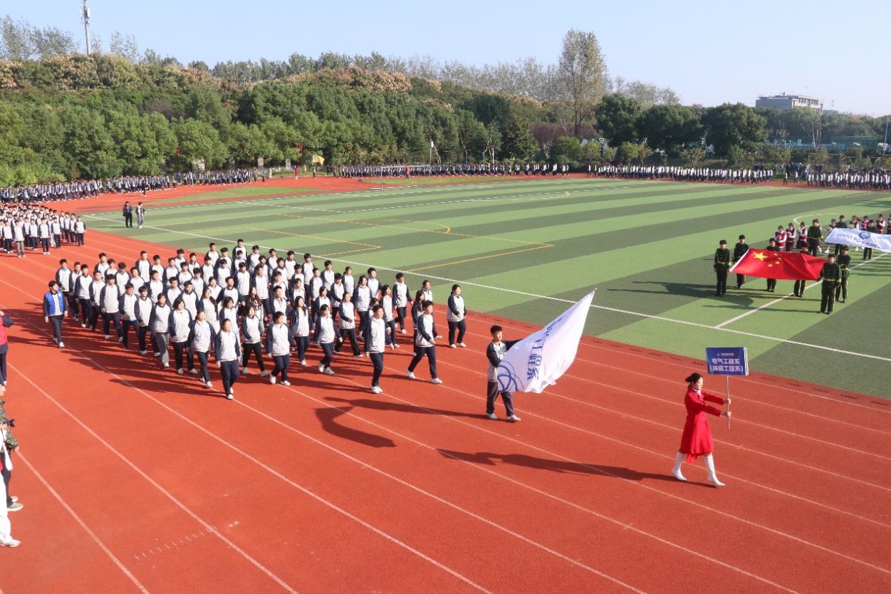 开幕式上,电气工程系、信息技术系、智能制造系、汽车技术系、现代服务系五大系部方阵依次登场,队员们步伐铿锵、口号嘹亮,结合专业元素的队形变换尽显各系风采,赢得了阵阵掌声。