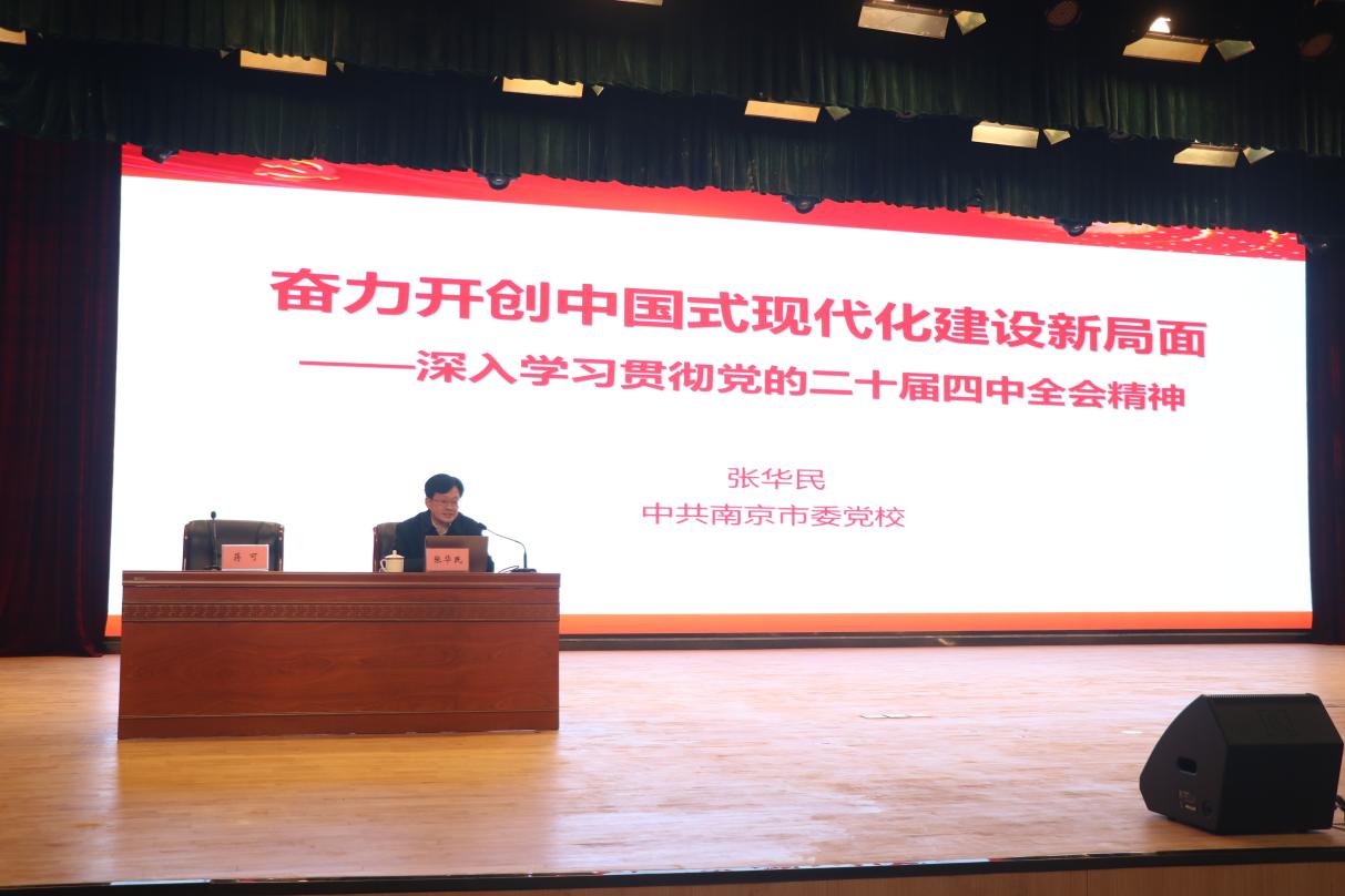 近日,学院邀请南京市委党校教授张华民,开展深入学习贯彻党的二十届四中全会精神专题讲座,学院党委书记蒋可主持会议,全体中层领导干部、党员聆听讲座。