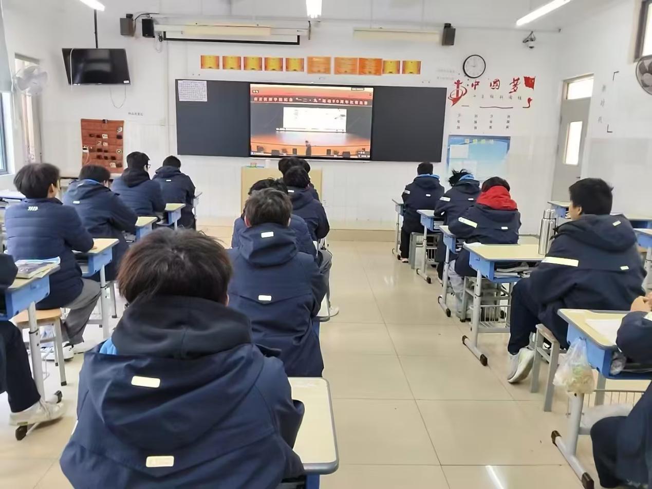为使学院广大师生都能参与到本次“一二・九”运动90周年纪念活动中来,深刻领会革命传统教育的意义,丰富学院思政教育形式,所有未在演出现场的同学们都以主题班会的形式通过校内直播观看了本场演出。教室里,师生们聚精会神观看比赛直播,跟随悠扬的旋律重温经典红歌,感受着舞台上传递的爱国热忱与奋进力量。直播过程中,班主任结合 “一二・九” 运动历史背景与歌曲内涵,适时开展互动讲解与思想引导;同学们认真聆听、热烈讨论,积极分享观赛感悟,表达对革命先辈的崇敬之情与“强国有我”的青春誓言。这场跨越空间的红色盛宴,让思想教育与活动育人实现了全覆盖,让爱国主义精神在校园的每个角落深深扎根。