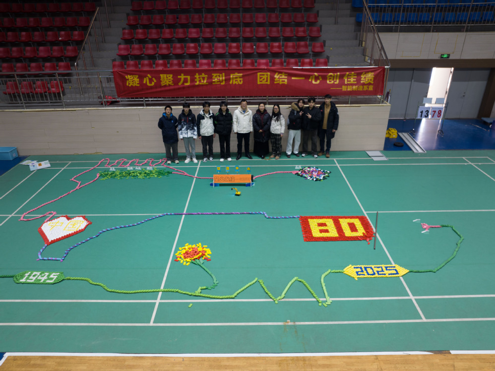 赛场之上,选手们凝神专注、沉着应战,彼此间默契配合、精益求精。翻飞的指尖下,一张张骨牌被赋予巧思与创意,拼接为承载历史记忆的立体图案。这些作品既生动再现反法西斯战争的历史瞬间,又巧妙融入各专业特色,充分展现出学生们的创新思维与团队协作能力。